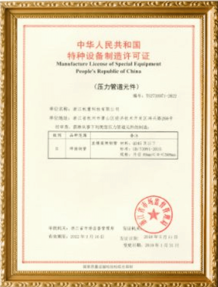 公司取得了壓力管道元件生產許可證